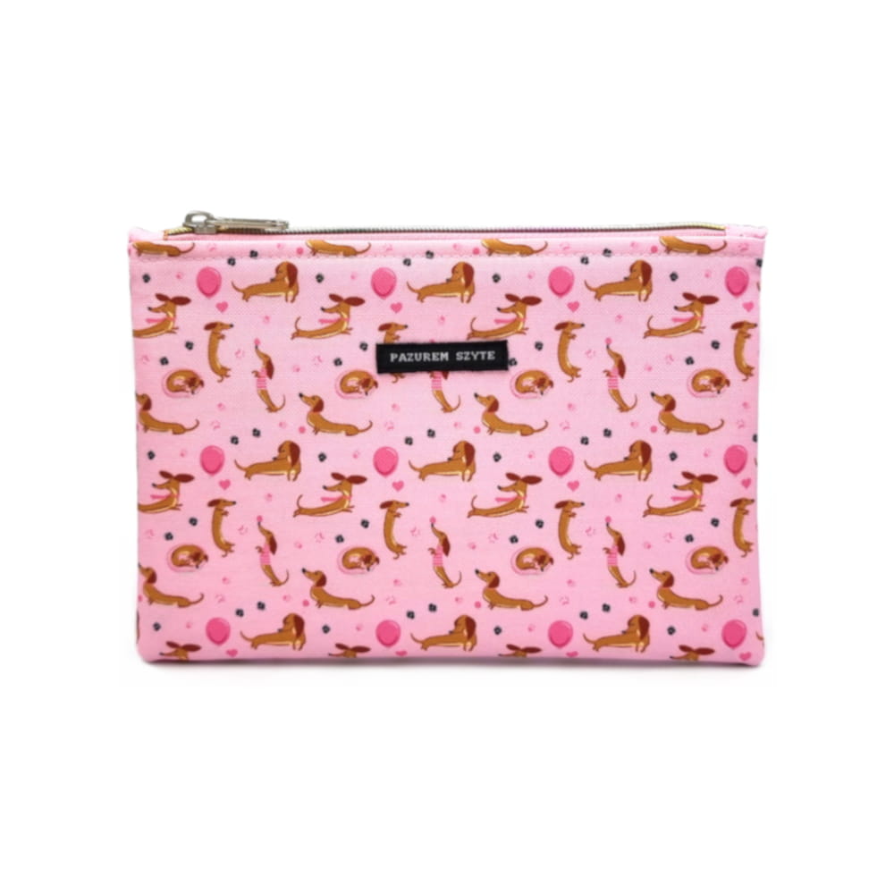 Kosmetyczka mała jamniki drobny druk różowa tkanina wodoodporna uszyta z poliestrowej tkaniny wodoodpornej.